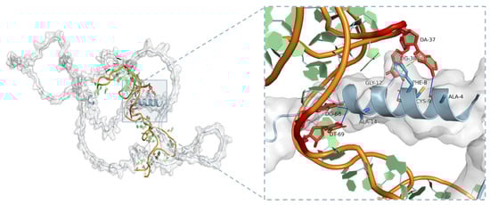 Molecular dynamics (MD), employed alongside wet experiments, is a powerful method used to predict or explore the interaction between ligands and receptors [43]. The structure of LPN was obtained from the AlphaFold Protein Structure Database (UniProtP: 31,096), and none is available in the PDB. The secondary structure of Seq.I1II3 was predicted using M-fold (www.unafold.org/mfold/, ΔG = −3.34 kcal/mol). With the help of PyMOL software (Version 3.11), interactions between the aptamer Seq.I1II3 and LPN were simulated to find the optimal docking model selected based on the binding free energy. This is the first time MD has been employed to predict the recognition between the aptamer and LPN. The 3D structure is shown in Figure 5, which was thought to be the best docking result. Based on the docking model, three different interactions were observed between Seq.I1II3 and LPN, including five hydrogen bonds, one hydrophobic interaction, and one Pi-Pi bond. Associating Figure 5 and Table S3, the binding sites in Seq.I1II3 involved four main nucleotides of A37, G38, G68, and T69. This indicated that the conserved motifs in Seq.I1II3 were likely to bind to the important structural domains in LPN proteins. The MD analysis can give some clues to further explore the aptamer interaction mechanism.