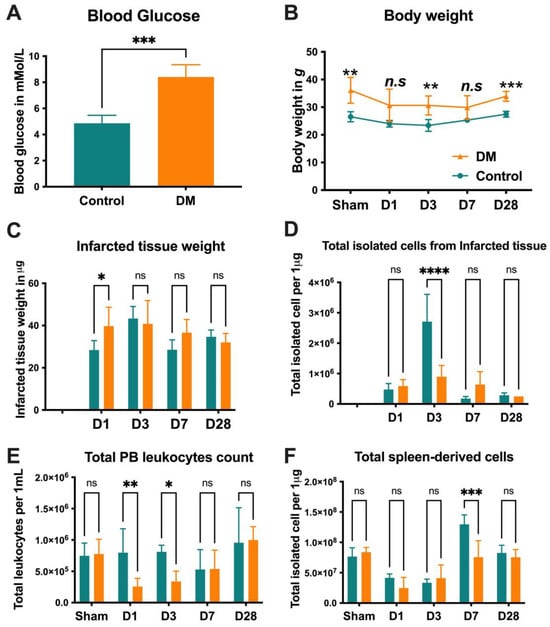 Group characteristics. The glucose levels and body weight of the diabetic (DM) group were significantly higher, confirming successful DM induction (A,B). The total number of isolated tissues and cells did not show significant differences, except for (C) the total amount of isolated cells from infarcted tissues on D3, (D) the total peripheral blood leukocyte count on D1 and D3, and (E) the total amount of spleen-derived cells on D7 (C–F). Data are represented as the mean ± SE. N = 10–12 mice per group. The experiments were repeated twice. In the graph, * p < 0.05, ** p < 0.01, *** p < 0.001, and **** p < 0.0001, ns/n.s means not significant, as determined by a Mann–Whitney test, Two-way ANOVA, followed by a Sidak or Benjamini’s multiple comparison test.