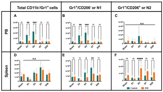 Neutrophil dynamics. The number of infiltrated total neutrophils and their N1 subset significantly increased at D1 and peaked at D3 in the PB of control mice (A,B) but insignificant in N2 subset (C). At D3 and D7, the total number of spleen-derived neutrophils did not changed (D) except N1 neutrophils gradually increased in the control group (E), whereas N2 subsets were enlarged in diabetes (F). Data are represented as the mean ± SE. N = six–eight mice per group. Experiments were repeated twice. In the graph, * p < 0.05, ** p < 0.01, *** p < 0.001, and **** p < 0.0001, ns/n.s means not significant, as determined by Two-way ANOVA, followed by a Sidak or Krieger and Yekutieli multiple comparison test.