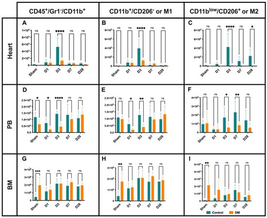 Macrophage dynamics. Infiltration of the M1 and M2 subsets into the ischemia tissue peaks at D3 in controls compared to DM (A–C). M2 macrophage recruitment demonstrate two waves on D3 and D28 (C). In control vs. DM PB, number of total and M1 macrophages increased from D1–D3, while the number of M2 cells increased from D3–D7 (D–F), indicating delayed and impaired macrophage infiltration, particularly M2 subset recruitment, in the ischemic myocardium of DM following MI. Sham group BM the total macrophage, M1, and M2 level are higher in DM groups (G–I). Data are represented as the mean ± SE. N = six–eight mice per group. Experiments were repeated twice. In the graph, * p < 0.05, ** p < 0.01, *** p < 0.001, and **** p < 0.0001, ns means not significant as determined by Two-way ANOVA, followed by a Sidak or Krieger and Yekutieli multiple comparison test.