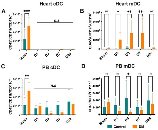 Dendritic cell dynamics. Although there were no significant differences observed in conventional dendritic cells (cDCs) in the heart and PB between DM and healthy mice (A,C), myeloid dendritic cells (mDCs) increased in the DM heart on D1-D7 (B). mDCs decreased on D3, indicating a possible mobilization of these cells from the PB to the heart during the acute phase of MI in DM (D). Data are represented as the mean ± SE. N = six–eight mice per group. Experiments were repeated twice. In the graph, * p < 0.05, ** p < 0.01, and *** p < 0.001, ns/n.s means not significant, as determined by Two-way ANOVA, followed by a Sidak or Krieger and Yekutieli multiple comparison test.