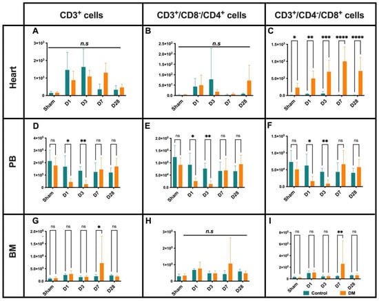 The total CD3+ cell recruitment to the myocardium gradually increased from D1 and peaked at D3 in the control mice, whereas the total recruited CD3+ peak was observed at D7 in the diabetic mice, indicating a delayed adoptive immune response to the aseptic necrosis (Figure 5A). When we further dissected CD3+ cells into helper T cells (CD3+/CD8−/CD4+) and cytotoxic T cells (CD3+/CD4−/CD8+), we found that the main infiltrated cells into the ischemic myocardium on D1 to D3 in the control group were helper T cells, whereas CD8+ cell recruitment was significant in the diabetic group (Figure 5B,C). Notably, CD8+ cell numbers were gradually elevated in heart tissue from D1 to D28 (and even in the sham-operated diabetic mice) (Figure 5C). The PB total T cell, T helper, and cytotoxic T cell levels diminished in the diabetes mice vs. their control counterpart on D1 and D3 (Figure 5D–F). On D7, the total T cells and its cytotoxic subset were significantly more increased in the BM of the DM group than in their healthy counterpart group (Figure 5G–I). These findings indicate a delayed and altered recruitment pattern of T cell subsets in regard to the ischemic myocardium, as well as abnormal T cell subsets in BM and PB, providing additional evidence of immune dysregulation in diabetes.
