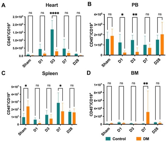B cell dynamics: B cell infiltration into the ischemic heart peaked around D3 in the control group compared to the DM mice (A). The DM group exhibited significantly lower numbers of B cells in the PB compared to the control group on D1–D3 (B). Interestingly, in the sham-operated diabetes group, the B cell numbers in the spleen were higher than in the healthy group. After MI, the number of B cells in the control mice significantly increased compared to the DM mice on D7 (C). On D7, the number of BM-B cells in the DM group was higher than in the control group (D), suggesting an impaired B cell response in Dm mice. Data are represented as the mean ± SE. N = six–eight mice per group. Experiments were repeated twice. In the graph, * p < 0.05, ** p < 0.01, and **** p < 0.0001, ns means not significant, as determined by Two-way ANOVA, followed by a Sidak or Krieger and Yekutieli multiple comparison test.