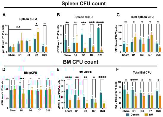 Endothelial progenitor cells colony formation assay (EPC-CFA) in the spleen and BM: In the spleen, the frequency of definitive EPC colonies (dEPC-CFUs) decreased in DM mice at D 3, D7, and D28 (A–C). In BM, dEPC-CFUs decreased in DM compared to control mice (D–F), suggesting that DM conditions significantly impair EPC colony-forming functionality by limiting EPCs’ differentiation from primitive to definitive. Data are represented as the mean ± SE. N = six–eight mice per group. Experiments were repeated twice. In the graph, * p < 0.05, ** p < 0.01, *** p < 0.001, and **** p < 0.0001, ns/n.s means not significant, as determined by Two-way ANOVA, followed by a Sidak or Krieger and Yekutieli multiple comparison test.