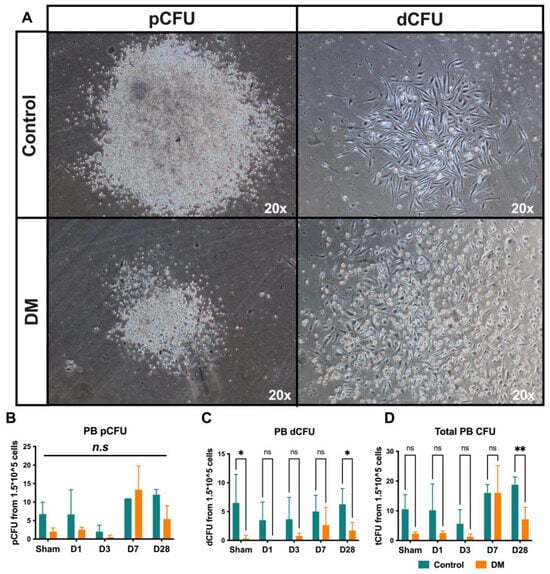 Endothelial progenitor cells colony formation assay (EPC-CFA) in PB: The primitive EPC colonies (pEPC-CFUs) have a lower density in the DM group, whereas, in the control group, the number of definitive EPC colonies (dEPC-CFU) was higher (A–D). Data are represented as the mean ± SE. N = six–eight mice per group. Experiments were repeated twice. In the graph, * p < 0.05 and ** p < 0.01, ns/n.s means not significant, as determined by Two-way ANOVA, followed by a Sidak or Krieger and Yekutieli multiple comparison test.