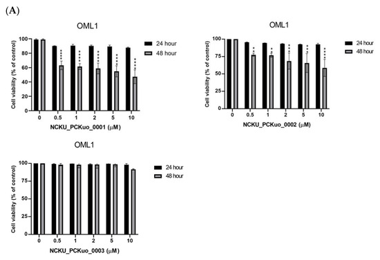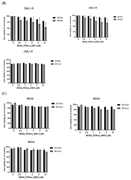 In previous studies, the compounds ent-18-acetoxy-7α-hydroxykaur-16-en-15-one, ent-1β-acetoxy-7α,14β-dihydroxykaur-16-en-15-one, and curcumin displayed the most significant inhibition of superoxide anion generation and elastase release, though more toxic effects were also observed [13,14,15] (Table 1). To confirm the effects of NCKU_PCKuo_0001, NCKU_PCKuo_0002, and NCKU_PCKuo_0003 on the growth and survival of the parental OML1 cell line and the radioresistant phenotype of the OML1-R cell line, they were treated with 0, 0.5, 1, 2, 5, and 10 μM NCKU_PCKuo_0001 and NCKU_PCKuo_0002 for 24 and 48 h, respectively. As shown in Figure 1, NCKU_PCKuo_0001 and NCKU_PCKuo_0002 induced significant cytotoxicity in both oral carcinoma cell lines.