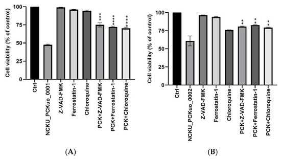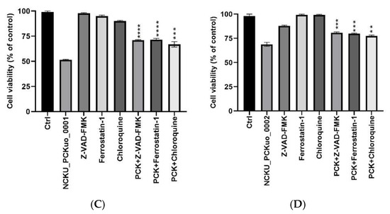To identify whether NCKU_PCKuo_0001- and NCKU_PCKuo_0002-induced cell death is regulated by a pan-caspase inhibitor (Z-VAD-FMK) or chloroquine (CQ, an autophagy inhibitor) and Ferrostatin-1 (Fer-1, a ferroptosis inhibitor), we treated the OSCC cells with NCKU_PCKuo_0001 and NCKU_PCKuo_0002 (10 μM, 48 h) and pre-treated them with Z-VAD-FMK (20 μM), CQ (10 μM), and Fer-1 (10 μM) before NCKU_PCKuo treatment (Figure 2). This result indicates that Z-VAD-FMK, CQ, and Fer-1 inhibit the decrease in cell viability.