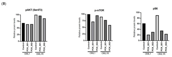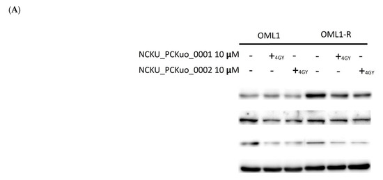To confirm the radioresistant phenotype of the OML1-R cell line, we determined the plating efficiency of the parental OML1 cells and the radioresistant OML-1R subline cells that were cultured after high-dose fractionated IR exposure (4 Gy) and then examined them using the clonogenic survival assay. Next, we determined that NCKU_PCKuo_0001 and NCKU_PCKuo_0002 at 10 μM in combination with IR dramatically inhibited the proliferation of OML1 and OML1-R cells. We also analyzed the expression profiles of AKT/mTOR signaling pathway-related proteins; pAKT (Ser 473) and p-S6 showed decreased expression levels in OML1-R cells (Figure 3). Thus, our findings suggest that the PI3K/AKT/mTOR signaling pathway is actively involved in OSCC radioresistance.