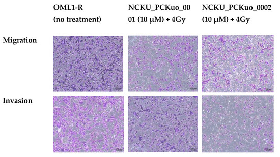 Radiation-enhanced cell metastasis and invasion is one important reason for the poor prognosis of tumors. Transwell migration assays were used to evaluate the effect of NCKU_PCKuo_0001 and NCKU_PCKuo_0002 on migration and invasion in OML1-R cells. Additionally, a Transwell migration assay performed to determine if NCKU_PCKuos had an effect on the metastatic properties of OSCC cells showed that the number of migrated cells decreased significantly in NCKU_PCKuo_0001- and NCKU_PCKuo_0002-treated OML1-R cells relative to the number in the control cells. Matrigel was coated on the upper chamber to stimulate the basement membrane in invasion assays. The results revealed that NCKU_PCKuo_0001 and NCKU_PCKuo_0002 decreased the number of cells invading the Matrigel-coated filters. Moreover, the number of invaded cells decreased significantly in OML1-R cells treated with NCKU_PCKuo_0001 and NCKU_PCKuo_0002 (Figure 4). These findings demonstrate that NCKU_PCKuo_0001 and NCKU_PCKuo_0002 play a role in the metastatic properties of OSCC.
