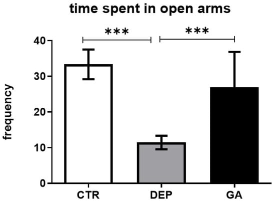 After analyzing the behavior of the rats, our results showed increased time spent in the open arms in the GA group compared to the DEP group (Figure 2). Time spent in the open arms is the most important point of the test because it focuses on the anxiety of the animals. This is consistent with previously published data (the only in vivo study) showing that GA may increase not only the time spent in the open arms but also the rearing frequency and/or locomotor activity (as the number of center crossings) in healthy animals []. In our current experiment, other forms of behavior were not changed in the EPM (Table 1). This could be influenced by the unpredictability of the behavior of the animals.