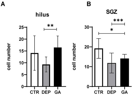 The number of proliferative Ki67-positive cells in the hilus (A) and SGZ (B) in individual groups of control animals (CTR), animals with depression-like behavior (DEP), and GA-treated animals (GA). Values are given as arithmetic mean ± SD. Significance is indicated by * p ˂ 0.05, ** p ˂ 0.01, and *** p ˂ 0.001.