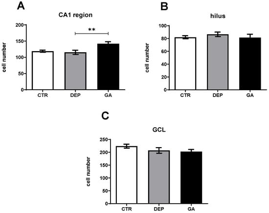 The number of NeuN-positive mature neurons in the DEP group stayed unchanged compared to the level of the neurons in the CTR group in the CA1 region and hilus and slightly decreased in granular cell layer (GCL). However, in the GA group, the number of NeuN-positive mature neurons was not increased compared to the DEP group in the hilus and in the GCL (Figure 4). In the GA group, the number of NeuN-positive mature neurons in the CA1 region was significantly increased (p ˂ 0.01) compared to the DEP group.