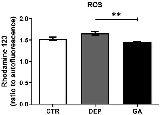 GA significantly reduced ROS (p ˂ 0.01) in blood leukocytes compared to the DEP group. In the DEP group, there was a nonsignificant increase in ROS in blood leukocytes compared to the CTR group (Figure 5).