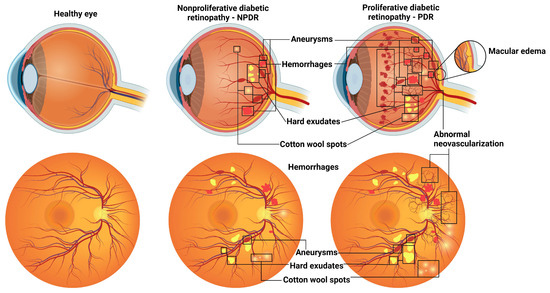 DR progression typically includes a non-proliferative stage of DR (NPDR) characterized by progressive intraretinal microvascular changes and a proliferative stage (PDR) characterized by the growth of newly formed vessels on the retina or optic nerve head [21]. Common features of NPDR include visible microaneurysms and flame or blot hemorrhages, while PDR is characterized by the growth of new vessels and retinal tissue edema [10]. The most common pathological features of NPDR and PDR are presented in Figure 2. The use of noninvasive imaging techniques, particularly optical coherence tomography (OCT), in conjunction with the introduction of intravitreal anti-vascular endothelial growth factor (anti-VEGF) therapies has significantly improved the early detection and treatment of diabetic macular edema (DME) and led to an improvement in the visual performance of those affected [22]. DME is a specific complication of DR that can occur at all degrees of severity in both NPDR and PDR patients [23]. DME, which occurs in approximately 25% of diabetic patients, is a major factor contributing to visual impairment. It is characterized by central thickening of the fovea, as observed via OCT, and fluorescein leakage, as detected via angiography [16].