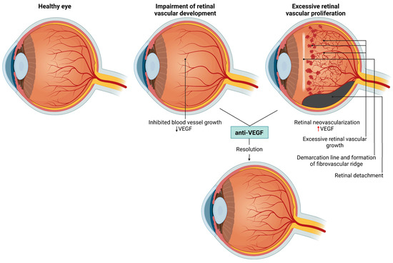 Retinopathy of prematurity (ROP)—different phases of ROP including impaired retinal vascular development in utero induced by low VEGF values, and pathological changes followed by increased VEGF production such as abnormal neovascularization, excessive fibrous tissue growth, and retinal detachment. Anti-VEGF therapy, applied at an early stage as prevention, or when the disease appears, can lead to resolution.