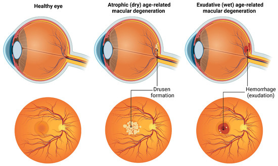 The pathogenesis of AMD is complex and includes genetic susceptibility, age-related disruption of retinal homeostasis, impaired lipid metabolism, immune activation leading to chronic inflammation, OS and ECM dysfunction, all of which contribute to the disease [36]. Pathology changes in patients with AMD affect the inner retinal layers of the macula and adjacent vessels, resulting in impaired central vision [37]. In dry AMD, there is gradual degeneration of the RPE and the outer retinal layers [38]. The wet form is characterized by abnormal choroidal neovascularization that invades both the RPE and the retina in a disorderly manner [38]. In the early clinical stages, both the dry and wet forms of AMD are characterized by the accumulation of lysosomal lipofuscin and extracellular drusen deposits and by degeneration of the RPE [35]. The accumulation of deposits on the retina, known as drusen, is a hallmark clinical feature of AMD and indicates the “dry” form of the disease [37]. Drusen are primarily composed of lipids, proteins, and carbohydrates and can be visualized as small white or yellowish deposits on the macula [33]. Approximately 10–15% of AMD patients develop advanced exudative disease. Differences in the dry and wet form of the AMD are presented in Figure 4.