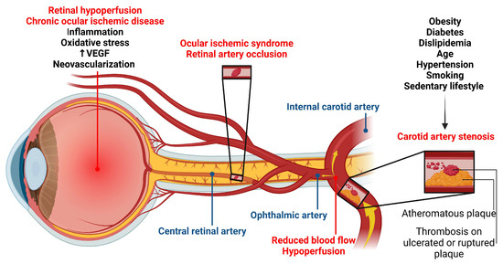 OIS is characterized by vision loss, orbital pain, visual field changes, and various signs in both the anterior and posterior segments of the eye. Approximately 7.5 cases per million people are diagnosed with OIS each year [71]. This condition is usually undiagnosed, with a poor prognosis, and accompanied by severe ischemic cardiovascular and cerebrovascular diseases. The 5-year survival rate of these patients is 60% [72]. The main cause of OIS is severe carotid stenosis caused by atherosclerosis leading to reduced perfusion pressure of the central retinal artery [71]. This ischemic insult increases the production of vascular endothelial growth factor (VEGF), resulting in neovascularization and increased vascular permeability [73]. OIS is diagnosed in the presence of amaurosis fugax with or without loss of vision, eye pain, conjunctival or episcleral injection, corneal edema, and ocular signs in the anterior and posterior chamber [74]. Fundus fluorescein angiography is commonly used to detect pathological changes, such as non-perfusion of the retina with or without neovascularization and internal carotid artery stenosis [71].