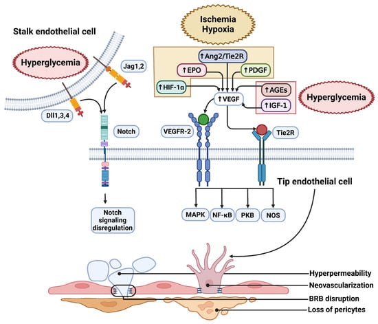 Molecular and cellular signaling in the pathogenesis of ischemic retinal diseases—the key role of VEGF. Abbreviations: Ang2, angiopoietin 2; EPO, erythropoietin; HIF-1α, hypoxia-inducible factor-1α; PDGF, platelet-derived growth factor; AGEs, advanced glycation end products; IGF-1, insulin-like growth factor 1; VEGF, vascular endothelial growth factor; VEGFR2, vascular endothelial growth factor receptor 2; Jag1,2, Jagged 1 and 2; Dll1,3,4, Delta-like ligands 1, 3 and 4; MAPK, mitogen-activated protein kinase; NF-κB, nuclear factor-kappa B; PKB, protein kinase B; NOS, nitric oxide synthase; BRB, blood–retina barrier.