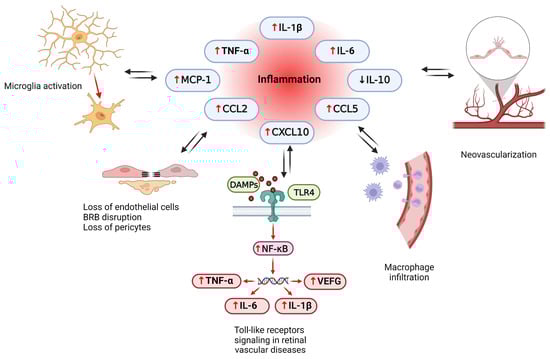 Inflammatory pathways in retinal vascular disorders—the interplay between different interleukins, chemokines, microglia, and development of neovascularization and vascular retinal diseases. Abbreviations: IL-1β, interleukin 1β; IL-6, interleukin 6; IL-10, interleukin 10; TNF-α, tumor necrosis factor α; MCP-1, monocyte chemoattractant protein 1; CCL2, CC motif chemokine ligand 2; CCL5, CC motif chemokine ligand 5; CXCL10, CXC motif chemokine ligand 10; DAMPs, damage-associated molecular pattern molecules; TLR4, toll like receptor 4; NF-κB, nuclear factor-kappa B; BRB, blood–retina barrier.