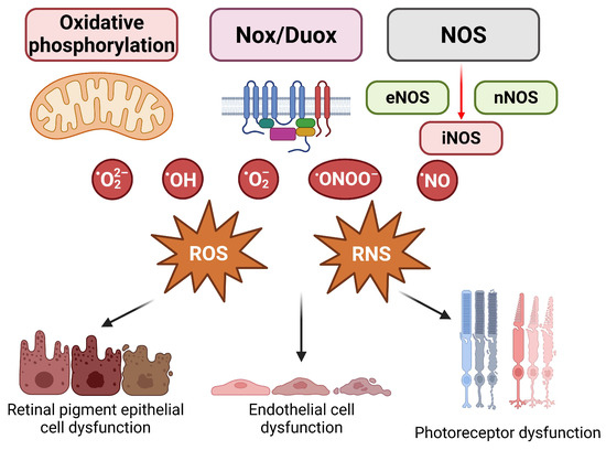 Oxidative stress and damage of retinal cells. Abbreviations: Nox/Duox, nicotinamide adenine dinucleotide phosphate (NADPH) oxidase/dual oxidase; NOS, nitric oxide synthase; eNOS, endothelial nitric oxide synthase; nNOS, neuronal nitric oxide synthase; iNOS, inducible nitric oxide synthase; •HO, hydroxyl radical; •O22, peroxide ion radical; •O2, superoxide anion radical; •ONOO, peroxynitrite; •NO, nitric oxide; ROS, reactive oxygen species; RNS, reactive nitrogen species.