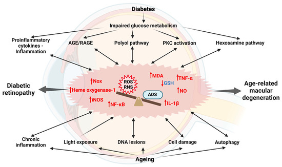 Both the anterior and posterior parts of the eye are susceptible to OS, and numerous diseases, including RVDs, are associated with increased levels of free radicals [151]. ROS are generated by the incomplete reduction of molecular oxygen and include hydrogen peroxide (H2O2), superoxide anion (O2−), hydroxyl radical (OH−), peroxyl radical (ROO−), and singlet oxygen (O2) [152]. In a physiological state, the cells of the retina are constantly exposed to increased OS caused by strong exposure to light and the function of visual signal transduction pathways, leading to the production of significant amounts of ROS. Factors such as the high oxygen consumption of the outer retina-RPE complex, exposure to strong light, abundance of photosensitizers in both the neurosensory retina and the RPE, and presence of easily oxidizable polyunsaturated fatty acids in the membranes of the outer photoreceptor segment collectively contribute to the initiation of cytotoxic responses [153]. The main sources of ROS in diabetes are oxidative phosphorylation in the mitochondria and the nicotinamide adenine dinucleotide phosphate (NADPH) oxidase system (Nox) [154]. The Nox family includes Nox1-Nox5, dual oxidase 1 (Duox1), and dual oxidase 2 (Duox2), enzymes that can generate either superoxide or hydrogen peroxide, depending on the isoform [155]. Because reactive nitrogen species (RNS) are normally produced in the human body, it is important to mention that physiological concentrations of nitric oxide (NO) are essential for normal vision, while excessive NO concentrations can be harmful [151]. The enzyme responsible for NO synthesis is NOS synthase (NOS), which catalyzes this process in the presence of oxygen and NADPH. There are three isoforms of NOS, neuronal (nNOS), endothelial (eNOS), and inducible (iNOS), which are induced under pathological conditions [156,157].