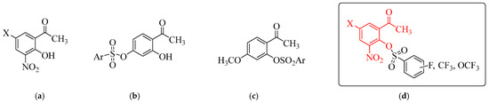 Chemical structures of hydroxyacetophenones (a), the sulfonic ester derivatives (b,c) and the target compounds (d). Red part represents ortho-hydroxyacetophenone scaffold.