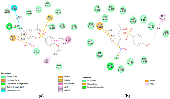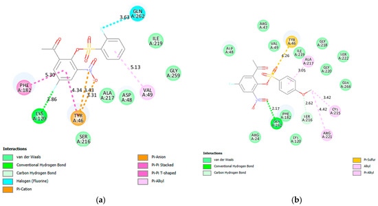 The native ligand forms four hydrogen bonds with the residues Ala217 (2), Arg221 and Ser216 which help embed this ligand in the active site (Figure 5). Additionally, the ligand forms π-π stacked interaction with Phe182 and two π-π T-shaped interactions with Tyr46. The residues Arg221 and Phe182 are also involved in attractive charge and π-sulfur interactions with the ligand. The fluorine atoms at the C-5 position of the acetophenone ring of 2a (Figure 5a) and one at the ortho position of the phenylsulfonyl group participate in hydrogen and halogen bonding interactions with Lys120 and Gln262, respectively. Hydrogen and halogen bonding interactions probably increased the residence time of this compound in the active site of PTP1B increasing the inhibition of this enzyme’s activity. A hydrogen bonding interaction is predicted between the uncharged oxygen atom of the nitro group of 2f and the residue Gln262 (Figure 5b). The oxygen atom of the methoxy group forms a weak carbon hydrogen bond with Ser216. Hydrogen bonding interaction with Gln262 and the weak carbon hydrogen bond formed with Ser216 probably increased the activity of 2f against PTP1B.