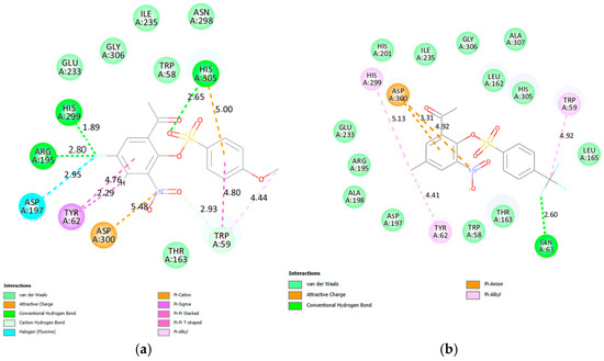 Compounds 2a, 2e, 2f, 2g, 2j, 2k, 2v and 2x as well as acarbose were docked into the active site of α-amylase (PDB code 3BAJ) and their corresponding poses are included in Figure S10 of the Supplementary Materials. The docked structure of acarbose shown in Figure S10 shows the hydroxyl groups engaged in several hydrogen bonding interactions with the residues i.e., Tyr62, Asp197, Glu233 and Asp300 (two) in the active site of α-amylase, which are involved in the hydrolysis of starch. Acarbose also participates in a π-alkyl interactions with Trp59 and His305 as well as π-donor hydrogen bond interaction with Asp300. The residues such as Arg195, Asn298, His299, Asp300, His305, Ala307 and Asp356 are responsible for the hydrolysis of starch [61]. The docking poses of derivatives 2f and 2v are included as Figure 4. The 5-fluorine atom of 2f (Figure 4a) is engaged in two hydrogen bonding interactions with His299 and Arg195 as well as a halogen bonding interaction with Asp197. His305 is involved in hydrogen bonding interaction with one of the oxygen atoms of the sulfonyl moiety. The hydrogen atom of the acetophenone ring ortho to the nitro group of this compound participates in a π-sigma interactions with Tyr62. The residue Thr163 forms a weak carbon hydrogen bond with the uncharged oxygen atom of the nitro group. Hydrophilic (hydrogen and halogen bond) interactions involve the 5-fluoro-3-nitroacetophenonesulfonic ester framework and not the 4-methoxyphenyl group. The observed increased inhibitory effect seems to be influenced by the hydrophilic interactions of the 5-fluoro-3-nitroacetophenone with the residues in the active site of this enzyme. The fluorine atom of the trifluoromethyl group of 2v forms a hydrogen bond with the residue Trp59. The strong electron-withdrawing inductive and resonance effects of the nitro group is more likely to polarize these molecules to enable the acetophenone ring to engage in electrostatic interactions with the amino acid residues of these carbohydrate hydrolyzing enzymes consistent with the design strategy.