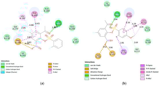 Allosteric inhibitors tend to be accommodated in the α3-α6-α7 helices of PTP1B to destabilize the network of hydrogen bonds, which are essential for the closure of the WPD loop, in turn, prohibit its closure [57,62]. Two hydrogen bonds are formed between the native ligand and the residues Leu192 and Asn193 in the allosteric site of PTP1B The π-cation and π-lone pair contacts with Lys197 and Phe196, respectively, as well as the hydrophobic (π-alkyl and π-π T-shaped) interactions with Phe280 also help to embed this ligand in the allosteric site of this enzyme. A halogen bond is predicted between fluorine atom of 2a (Figure 6a) and the residue Glu277. The carbonyl oxygen and one of the oxygen atoms of the sulfonyl moiety of this compound form a conventional hydrogen bond and a weak carbon hydrogen bond with Asn193, respectively. The increased hydrophobic interactions with amino acid residues in the allosteric site predicted for this compound are consistent with its increased inhibitory activity against PTP1B. A conventional hydrogen bond is formed between an oxygen atom of the sulfonyl group of 2f (Figure 6b) and Asn193. It is envisaged that the formation of a hydrogen bond with Asn193 in the helices of α3–α6 will restrict the WPD loop to its open conformation and inactivate PTP1B. These compounds are predicted to target strongly the allosteric site and some protein residues on the side pockets at the borders of the catalytic site, which make them potential PTP1B inhibitors with reduced side effects.