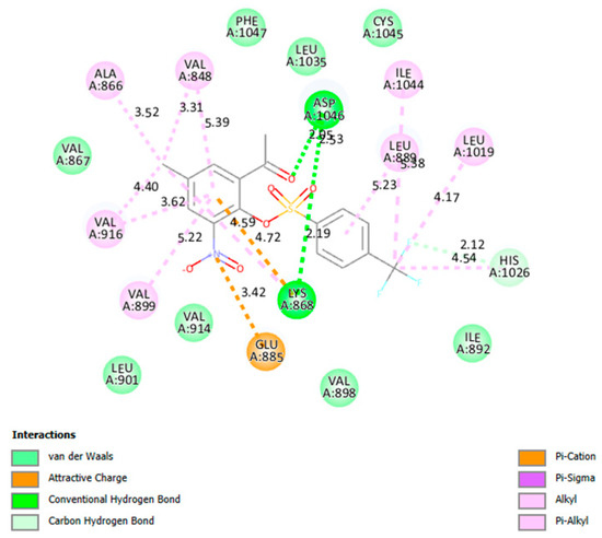 Since VEGFR-2 has also been identified as a key biochemical target for the early diagnosis of diabetes retinopathy [12,13], we also evaluated compounds 2a, 2e, 2f, 2g, 2j, 2k, 2v and 2x through an in vitro enzymatic assay for potential to inhibit the activity of VEGFR-2. The inhibition curves of these derivatives against VEGFR-2 are included as Figure S5 of the Supplementary Materials and the corresponding IC50 values are also represented in Table 2 using nintedanib as a reference standard for the assay are also represented in Table 2. Nintedanib is a multiple receptor tyrosine kinase inhibitor capable to retard the activities of the fibroblast growth factor receptor-1 (FGFR-1), platelet derived growth factor receptor beta (PDGFRβ) and VEGFR-2 [58]. The test compounds exhibited moderate to weak inhibitory effect on the VEGFR-2 activity compared to nintedanib (IC50 = 1.4 ± 0.42 µM) with the IC50 values in the range 16.3 ± 0.29–34.4 ± 0.26 µM. The scaffolds of strong VEGFR-2 inhibitors comprise a flat hetero aromatic ring system to occupy the ATP (adenosine triphosphate) binding or hinge region, a hydrogen bond rich region with donor–acceptor pair (e.g., an amide or urea moiety) and the distal hydrophobic region [59]. The test compounds are substituted with hydrogen bond accepting moieties on the acetophenone ring for possible binding to the hinge region and an aryl sulfonyl ring as a distal hydrophobic tail to target the allosteric site of VEGFR-2. However, these compounds lack a hydrogen bond rich region with donor–acceptor pair present on the scaffolds of VEGFR-2 kinase inhibitors. The lack of this motif on the scaffolds of the sulfonic ester derivatives 2 probably accounts for the observed reduced inhibitory activity against this enzyme. Only compound 2v substituted with a 5-methyl and a 4-(trifluoromethylphenyl)sulfonyl moiety as a distal hydrophobic tail exhibited moderate inhibitory activity against VEGFR-2 with an IC50 value of 16.3 ± 0.29 µM. The 4-trifluoromethylphenyl group probably resulted in increased hydrophilic (hydrogen and/or halogen bonding) and/or hydrophobic (eg, π-π stacking, π-π T shaped, π-alkyl, alkyl) interactions with the residues in the receptor to enhance the inhibitory effect of 2v against VEGFR-2. Compound 2v is a potential MTDL against T2DM capable of inhibiting both carbohydrates hydrolysing enzymes and PTP1B as well as VEGFR-2 activities.