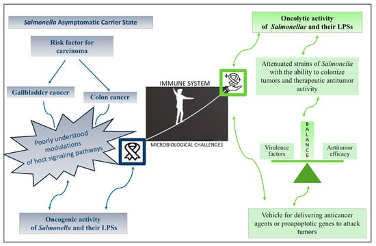 Figure 1. The role of Salmonella in cancer treatment and in the development and progression of cancer. The Salmonella carrier state represents a risk factor for gallbladder cancer and colon cancer. Salmonella strains have been engineered to be an effective cancer therapy tool.