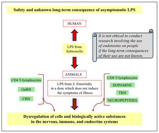 In view of the above, the presence of LPS from S. Enteritidis in the body in an amount that does not induce any symptoms of illness may result in unknown long-term consequences associated with its action on the cells and biologically active substances in the nervous, immune, and endocrine systems [76,77,78,79].
