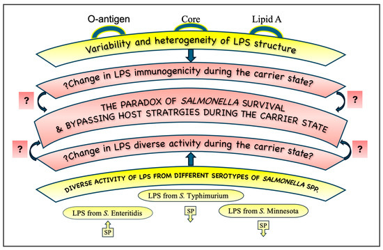 An important element of the work on Salmonella and LPSs from Salmonella spp. is the analysis of their changeability. Future research strategies should take into account diverse LPS biological activity, which is dependent not only on the species but also on the serotypes of the bacteria from which they are derived. Bacteria are organisms changing their properties, and hence posing various threats, an example of which is the issue of antimicrobial resistance (AMR), with special consideration given to multiresistant bacterial strains. Salmonella spp. has a range of mechanisms to prevent the action of many antimicrobials used in clinical medicine. AMR is a very important issue related to the carrier state of Salmonella spp. Moreover, the relationship between certain virulence determinants, i.e., virulence genes and antibiotic resistance, occurs in Salmonella [7,104]. It seems that each serovar has acquired a unique set of genes that enable them to use distinct strategies to modulate the host immune response. Moreover, metagenomic analysis of Salmonella spp. genes allow for the determination of the expression of bacterial genes involved in LPS biosynthesis. Many genes are involved in LPS biosynthesis, and the relationship between changes in the biosynthesis gene expression and LPS concentration is not straightforward. For example, a rarely reported wzxE gene is involved in bacterial LPS biosynthesis by encoding a flippase that can flip the precursor of LPS across the membrane into the periplasm space. The wzxE from Salmonella can mediate the bacterial ability of adhesion and invasion in host cells, and can affect host immune responses by regulating O-antigen flipping [105].