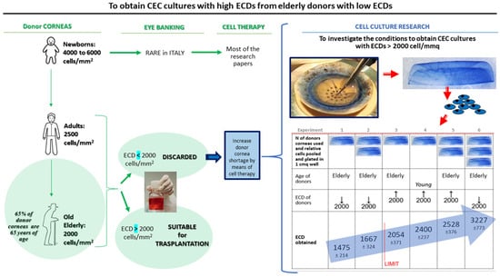 The aim of our study is therefore to evaluate whether corneas, which are unsuitable for transplantation (as having ECDs < 2000 cells/mm2), or corneas from elderly donors, which represent the overall majority of the tissues collected by eye banks, would allow the isolation of CECs, leading to in vitro cultures with ECDs > 2000 cells/mm2. The influence of parameters such as donor age and donor cornea ECD will also be evaluated (Figure 1). If such results were achieved, eye banks would have an important tool to increase the pool of corneas suitable for transplantation, either directly from deceased donors or as an advanced therapy medicinal product.