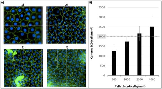 Number of cells (CECs) plated and the endothelial cell density (ECD) of the cultures obtained. (A) Photos of the cultures. (B) Graphical representation of the data. CECs were plated at 500 (A1), 1000 (A2), 2000 (A3) and 4000 (A4) cells/mm2; relative ECDs obtained: 1247 ± 315, 1743 ± 284, 2163 ± 359 and 2512 ± 533 cells/mm2. Magnification: 20×; scale bar: 100 µm.