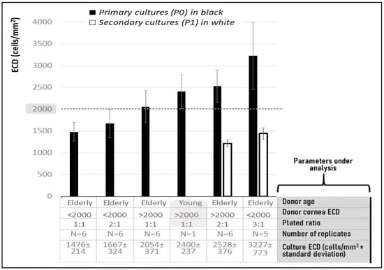 - Corneas from elderly donors, with ECD > 2000 cells/mm2 plated with a 2:1 ratio (i.e., two corneas to obtain one CEC culture) were able to generate primary and secondary cultures with ECDs of 2528 ± 376 cells/mm2 and 1213 ± 74 cells/mm2, respectively;