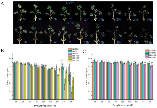 Effects of acute drought stress on the morphology and water content in shoots of different peanut cultivars. (A) Morphological changes in the shoots of drought-tolerant cultivar HY22 and the drought-sensitive cultivar FH18 after 0, 3, 6, 9, 12, 16, 20, 24, and 36 h of drought treatment. (B) Water content in different layers and (C) stem layers from HY22 and FH18 after 0, 3, 6, 9, 12, 16, 20, 4, and 36 h of drought treatment. Values represent the means of three replicates; error bars indicate ± standard error; letters denote significant differences between HY22 and FH18 as determined using analysis of variance (ANOVA; the letters in the graph were significant at the 0.05 level of significance, with significant differences between letters in the same treatment time). L1, L2, and L3 represent different leaf layers from the root to the apical point; S1 and S2 represent different stem levels from the root to the apical point. “HY22” refers to the drought-tolerant cultivar Huayu 22, and “FH18” denotes the drought-sensitive cultivar Fuhua 18.