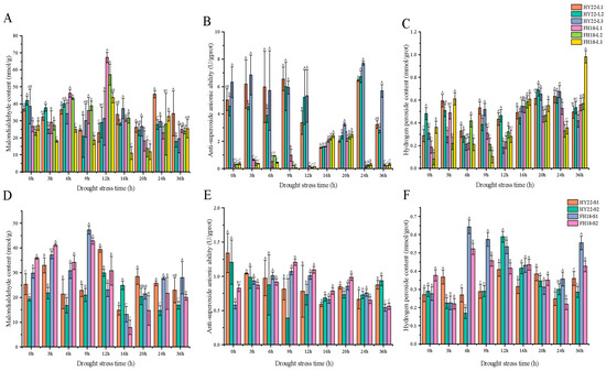 Plants produce large amounts of ROS under drought stress and generate malondialdehyde (MDA) through membrane lipid peroxidation [26,27]. Under drought conditions, the MDA contents of the two peanut cultivars first increased and then decreased. A significant MDA peak in HY22 leaves occurred after 24 h, whereas in FH18 leaves, it appeared after 12 h (Figure 2A). The highest MDA peak for HY22 was observed in the stems after 12 h, and for FH18, after 9 h. Thus, significant MDA accumulation occurred earlier in FH18 than that in HY22 (Figure 2D), indicating that HY22 maintained a more intact membrane structure during the early stages of drought stress.