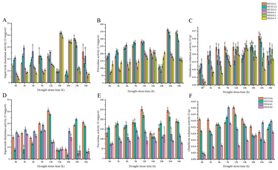 The hydrogen peroxide content in the leaves of HY22 peaked after 20 and 24 h, while it was significantly higher in FH18 after 3, 16, and 36 h (Figure 2C). Compared with the leaves, the changes in the stems were more pronounced. The peak hydrogen peroxide content in HY22 stem occurred after 12 h, compared to 6 h in FH18 (Figure 2F). Early in the acute drought stress, anti-superoxide anion activity was enhanced in the susceptible cultivar FH18. Conversely, in HY22, the peak of hydrogen peroxide occurred later, indicating that this cultivar exhibited superior anti-superoxide anion activity compared to the drought-sensitive cultivar.