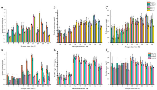 Effects of acute drought stress on soluble protein, soluble sugar, and proline content in the shoots of different peanut cultivars. (A) Soluble protein, (B) soluble sugar, and (C) proline contents in different leaf layer samples from the drought-tolerant cultivar HY22 and the drought-sensitive cultivar FH18 after 0, 3, 6, 9, 12, 16, 20, 4, and 36 h of drought treatment. (D) Soluble protein, (E) soluble sugar, and (F) proline contents in different stem layer samples from HY22 and FH18 cultivars after 0, 3, 6, 9, 12, 16, 20, 4, and 36 h of drought treatment. Values are means of three replicates; error bars indicate ± standard error; letters indicate significant differences between HY22 and FH18 as determined via analysis of variance (ANOVA; the letters in the graph were significant at the 0.05 level of significance, with significant differences between letters in the same treatment time). L1, L2, and L3 represent different leaf layers from the root to the apical point; S1 and S2 represent different stem layers from the root to the apical point.