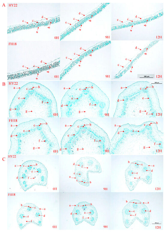 Anatomical structures in different peanut cultivars under acute drought stress at the seedling stage (500×). (A) Leaf anatomical structures: a. upper epidermis; b. fence tissue; c. sponge tissue; d. water storage tissue; and e. epidermis. (B) Stem anatomical structures: a. epidermis; b. vascular bundle sheath; c. vascular bundle cap; d. phloem; e. cambium; f. xylem; and g. medullary ray. (C) Petiole anatomical structures: a. epidermis; b. vascular bundle sheath; c. vascular bundle cap; d. phloem; e. xylem; and f. medullary ray. “HY22” refers to the drought-tolerant cultivar Huayu 22, and “FH18” denotes the drought-sensitive cultivar Fuhua 18. “0H” denotes 0 h after acute drought stress, “9H” denotes 9 h after, and “12H” denotes 12 h after.
