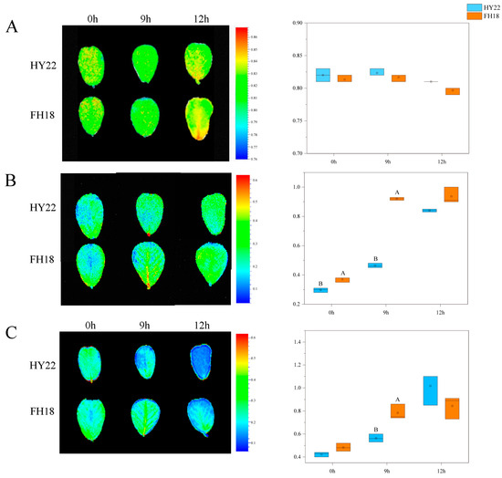 The Fv/Fm ratio represents the photochemical reaction efficiency at the center of PSII. Initially, the leaves of HY22 were yellow at 0 h but changed to yellow-green after 9 h of drought stress. By 12 h, the leaves displayed alternating yellow-green colors (Figure 6A). The trend in leaf color change for FH18 was comparable to that in HY22, except that the yellow occupied a larger proportion of the leaf color in FH18 after 12 h, and the value decreased without significance (Figure 6A).