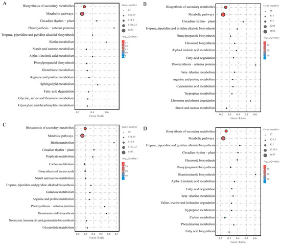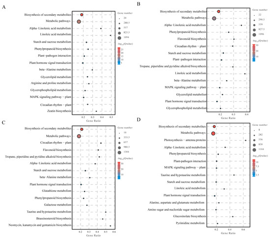Biosynthesis of secondary metabolites in the stems of HY22 under drought stress was significantly enriched in the following pathways: biosynthesis of secondary metabolites (9 h: 1093/12 h: 1095), metabolic pathways (9 h: 721/12 h: 737), alpha-linolenic acid metabolism (9 h: 154/12 h: 139), linolenic acid metabolism (9 h: 119/12 h: 53), starch and sucrose metabolism (9 h: 108/12 h: 89), phenylpropanoid biosynthesis (9 h: 86/12 h: 138), plant-pathogen interaction (9 h: 85/12 h: 82), plant hormone signal transduction (9 h: 72/12 h: 50), β-alanine metabolism (9 h: 66/12 h: 53), glycerolipid metabolism (9 h: 60/12 h: 50), glycerophospholipid metabolism (9 h: 54/12 h: 44), MAPK signaling pathway—plant (9h: 49/12h: 51), and circadian rhythm—plant (9 h: 47/12 h: 103) (Figure 8A,B). The biosynthesis of secondary metabolites in stems of FH18 under drought stress was significantly enriched in the following pathways: biosynthesis of secondary metabolites (9 h: 1300/12 h: 1100), metabolic pathways (9 h: 844/12 h: 664), alpha-linolenic acid metabolism (9 h: 89/12 h: 115), starch and sucrose metabolism (9 h: 80/12 h: 61), plant hormone signal transduction (9 h: 72/12 h: 46), and phenylpropanoid biosynthesis (9 h: 67/12 h: 91) (Figure 8C,D).