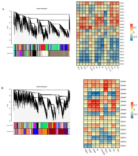 WGGNA of effectively expressed peanut genes under acute drought stress during the seedling stage. (A) Hierarchical cluster tree showing the co-expression modules in peanut leaf tissues identified using WGCNA. Each leaf in the tree represents a single gene. Twenty-one modules are labeled with different colors to represent major tree branches, and correlation analysis was performed between gene co-expression network modules and physiological indices. (B) Hierarchical cluster tree showing the co-expression modules in peanut stem tissues identified by WGCNA. Each leaf in the tree represents a single gene. Seventeen modules were labeled with different colors to represent major tree branches, and correlation analysis was performed between gene co-expression network modules and physiological indices. For (A,B), the horizontal axes represent different physiological traits, and the vertical axes represent the eigengenes in each module. Each frame contains the corresponding correlations and p-values (* p < 0.05, ** p < 0.01, *** p < 0.001). In the co-expression network, the critical degree of each gene is indicated by the color depth, which indicates a higher critical degree of the gene.