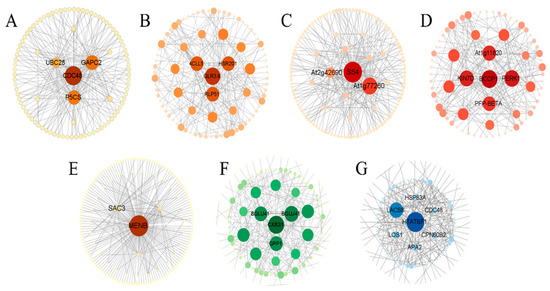 Co-expression networks of key genes in seven peanut modules under acute drought stress during the seedling stage. Co-expression networks of key genes in the leaf tissue module. (A) MM06, (B) MM13, (C) MM16, and (D) MM19; co-expression networks of key genes in the stem tissue module: (E) MM02, (F) MM04, and (G) MM06. The size of the nodes indicates the connection degrees of the genes in the network; larger nodes represent a greater number of connections with other genes.