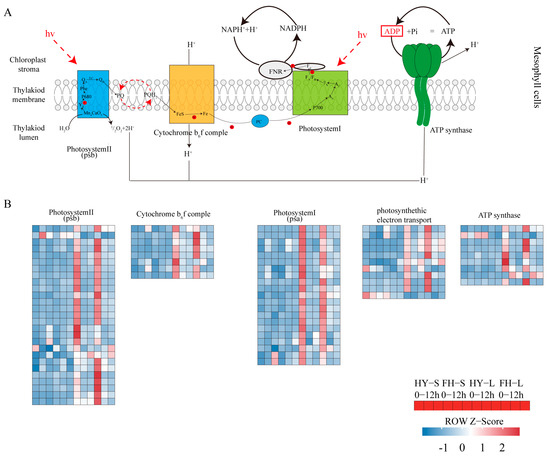 Heatmap showing differentially expressed genes (DEGs) in response to acute drought stress involved in photosynthesis and electron transportation pathways. (A) The model of photosynthesis and electron transportation pathways in peanut mesophyll cells. Photosysytem II (psb), cytochrome b6f complex, photosystem I, and ATP synthase are anchored in the thylakiod membrane. The oxygen-evolving complex in photosystem II resolves water into two molecules of hydrogen and one molecule of oxygen. Electrons reach plastoquinone (PQ) through a circulatory mechanism, which in turn releases a hydrogen ion in the thylakoid. The cytochrome b6f complex transfers electrons from plastoquinone to plastocyanin (PC), which then transfers electrons to PSI. Finally, electrons reach ferredoxin (Fd) and are reduced. As hydrogen ions flow out of the thylakoid membrane due to a concentration gradient, ATP is synthesized by ATP synthase. (B) Each color patch on the heatmap represents the FPKM value. Red and blue indicate significant upward and downward expression, respectively (log2|fold-change| ≥ 1).