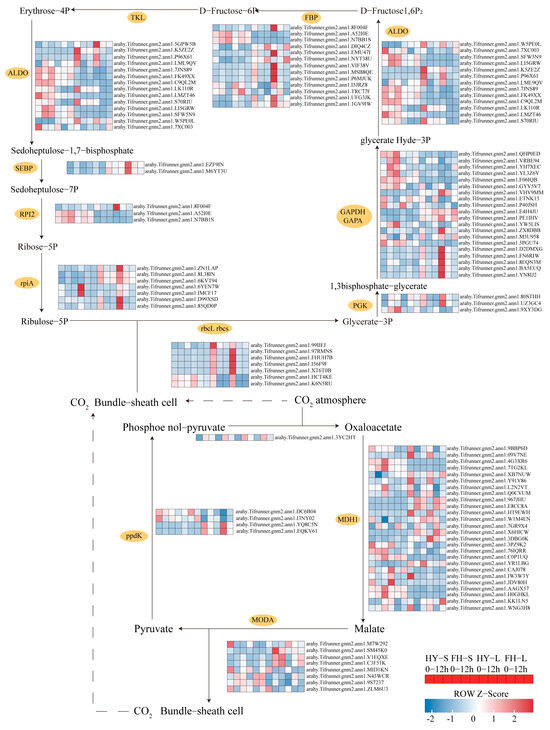 Most genes involved in carbon fixation were downregulated in the leaves of both cultivars. However, the extent of downregulation for ribulose-bisphosphate carboxylase small chain (rbcS) was less severe in the stems of both cultivars, and the downregulation fold was low in the stems of HY22, specifically for arahy.Tifrunner.gnm2.ann1.FHUH7B, arahy.Tifrunner.gnm2.ann1.I56F9F, and arahy.Tifrunner.gnm2.ann1.HCT4KE. Conversely, the genes associated with ribulose-bisphosphate carboxylase large chain (rbcL), such as arahy.Tifrunner.gnm2.ann1.99IIFJ, were upregulated in HY22 stems. Similarly, genes encoding phosphoglycerate kinase (PGK3) were upregulated in the stems of both cultivars, although their expression varied in the leaves with arahy.Tifrunner.gnm2.ann1.YW5LIS and arahy.Tifrunner.gnm2.ann1.9XY3DG being upregulated in HY22 after 9 and 12 h, respectively (Figure 12; Table S2). Furthermore, genes related to glyceraldehyde-3-phosphate dehydrogenase (NADP+) (phosphorylating) (GAPA), specifically arahy.Tifrunner.gnm2.ann1.D2DMXG and arahy.Tifrunner.gnm2.ann1.FN6RIW were upregulated at 9 h and downregulated at 12 h in HY22 stems but remained higher than the levels at 0 h. Conversely, they were downregulated at 12 h in the stems of FH18, showing lower levels than at 0 h. arahy.Tifrunner.gnm2.ann1.VRBE94 and arahy.Tifrunner.gnm2.ann1.YL3Z6V were significantly upregulated in the stems of HY22. Additionally, genes related to fructose 1,6-bisphosphate aldolase (ALDO), including arahy.Tifrunner.gnm2.ann1.P96X61, arahy.Tifrunner.gnm2.ann1.LI5GRW, and arahy.Tifrunner.gnm2.ann1.LML9QV displayed similar upregulation trends in the stems of HY22 (Figure 12; Table S2). Genes encoding fructose-1, 6-bisphosphatase I (FBP), such as arahy.Tifrunner.gnm2.ann1.P6MJUK and arahy.Tifrunner.gnm2.ann1.MSB8QE were upregulated in HY22 stems compared with FH18 plants but showed less downregulation in HY22 leaves compared to FH18 plants. Four genes encoding tyrosine kinase-like (TKL) proteins were also significantly upregulated in HY22 stems and less so in HY22 leaves. Similar expression patterns were observed for genes related to RPl2 (Figure 12; Table S2).