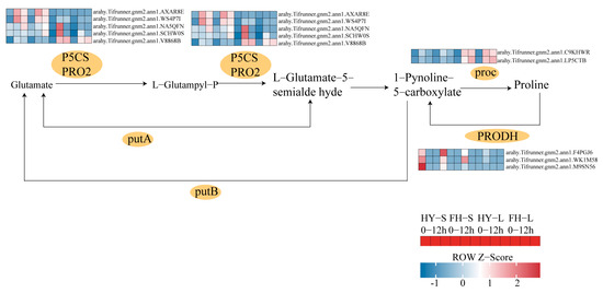 Under drought stress conditions, four genes encoding Δ1-pyrroline-5-carboxylate synthase (P5CS)—arahy.Tifrunner.gnm2.ann1.1W477Y, arahy.Tifrunner.gnm2.ann1.AXAR8E, arahy.Tifrunner.gnm2.ann1.V8868B, and arahy.Tifrunner.gnm2.ann1.WS4P7I—were significantly upregulated in HY22 shoots. Furthermore, two proC-encoding genes that catalyze the conversion of 1-pyrroline-5-carboxylate to proline, namely arahy.Tifrunner.gnm2.ann1.77YH77 and arahy.Tifrunner.gnm2.ann1.0II3I, were continuously upregulated in the leaves of HY22 under prolonged drought stress (Figure 13; Table S2). Conversely, three genes related to the proline dehydrogenase (PRODH) catalysis—arahy.Tifrunner.gnm2.ann1.WK1M58, arahy.Tifrunner.gnm2.ann1.F4PGJ6, and arahy.Tifrunner.gnm2.ann1.M9SN56—were significantly downregulated in HY22, whereas they were upregulated in FH18 (Figure 13; Table S2). As such, we infer that drought-stressed cultivars could regulate proline synthesis by upregulating the levels of the corresponding genes.