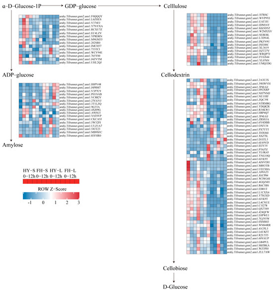 In the starch and sucrose metabolism pathway, four genes encoding B-glucosidase (CELB), which catalyzes cellulose to cellodextrin, namely arahy.Tifrunner.gnm2.ann1.FUGS44, arahy.Tifrunner.gnm2.ann1.KKSD5Z, arahy.Tifrunner.gnm2.ann1.UMQ1DG, and arahy.Tifrunner.gnm2.ann1.YL076N, were initially downregulated at 9 h but slightly upregulated at 12 h in both HY22 and FH18. However, arahy.Tifrunner.gnm2.ann1.KKSD5Z in the stem of HY22 exhibited continuous upregulation. Similarly, the genes encoding bglX and bglB followed this pattern of downregulation at 9 h and slight upregulation at 12 h in both cultivars (Figure 14; Table S2). However, some genes were upregulated at 12 h with almost the same expression levels as the control in both cultivars. In contrast, abundant genes encoding ADP-glucose pyrophosphorylase (glgC), glycogen synthases (glgA), and WAXY, which promotes the conversion of α-D-glucose-1P to amylose, were significantly upregulated at 9 h and slightly downregulated at 12 h in both cultivars. Upregulated expression levels at 9 h were more significant in HY22 stems (Figure 14; Table S2).