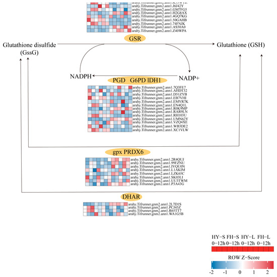Most genes encoding glutathione reductase (GSR), glutathione peroxidase (GPX), and glucose-6-phosphate dehydrogenase (G6PD) were upregulated at 9 h but downregulated at 12 h in both HY22 and FH18. However, three genes encoding dehydroascorbate reductase (DHAR) were upregulated at both 9 and 12 h, with arahy.Tifrunner.gnm2.ann1.R65TT7 and arahy.Tifrunner.gnm2.ann1.WA1G5B showing significant upregulation in both the stems and leaves of HY22 (Figure 15; Table S2). Two genes related to NADP-dependent isocitrate dehydrogenase (ICDH) were downregulated at 9 and 12 h in the two cultivars; however, arahy.Tifrunner.gnm2.ann1.D51ZYB, in the leaves of HY22, was upregulated compared with the expression in the CK at 12 h. Furthermore, arahy.Tifrunner.gnm2.ann1.RH103U exhibited different expression trends in stems and leaves, with constant upregulation in stems and downregulation in leaves of both cultivars (Figure 15; Table S2).